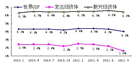 世界經(jīng)濟(jì)在經(jīng)歷2010年“脆弱而不平衡”的復(fù)蘇后,進(jìn)入2011年,這種復(fù)蘇再度遭遇挫折,形勢也變得更為復(fù)雜多變。從利比亞、敘利亞、埃及和也門為代表的中東地區(qū)政治危機(jī),到日本地震重創(chuàng)世界供應(yīng)鏈,到歐債危機(jī)不斷深化,再到標(biāo)準(zhǔn)普爾下調(diào)美債評級。一系列經(jīng)濟(jì)政治事件使得全球經(jīng)濟(jì)動蕩不安,下行風(fēng)險也不斷加大。2011年9月IMF大幅下調(diào)今明兩年全球經(jīng)濟(jì)增速預(yù)期,分別下調(diào)0.3%及0.5%,均降至4%的水平;發(fā)達(dá)經(jīng)濟(jì)體今年的經(jīng)濟(jì)增長率由此前預(yù)計(jì)的2.2%下調(diào)至1.6%,2012年的增長率由此前的2.6%下調(diào)至1.9%;新興及發(fā)展中經(jīng)濟(jì)體的經(jīng)濟(jì)增長率由6.6%及6.4%分別下調(diào)至6.4%和6.1%。
