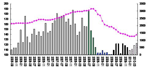 • 年初以來造船市場充其量是2009年下半年行情的延續(xù),如果按上述水平推算,保守估計2010年全年成交水平將會達(dá)到6000萬載重噸左右。