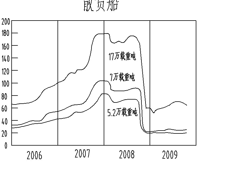 以下是2006年1月-2009年10月世界部分船型(散貨船)新船現(xiàn)售價(jià)格走勢圖