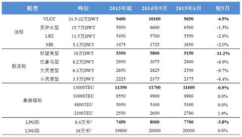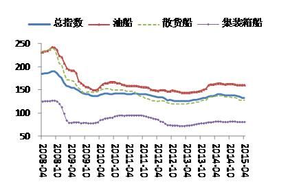 2)2015年4月新船價(jià)格綜合指數(shù)為133點(diǎn),較2014年中140點(diǎn)的高點(diǎn)下滑7點(diǎn),典型船型新船價(jià)格再次下滑趨勢(shì)十分明顯。