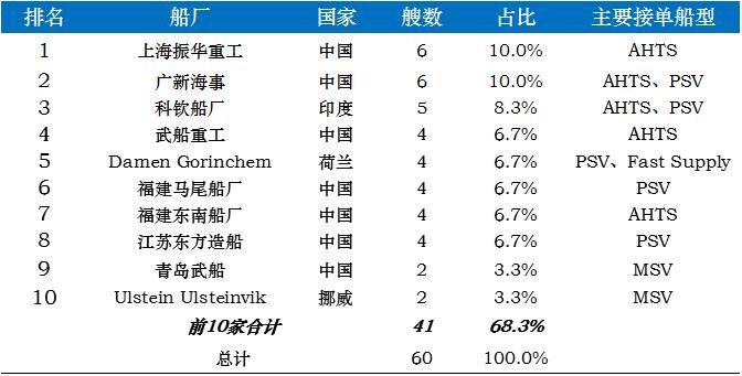 2)以艘數(shù)計(jì),上海振華重工、廣新海事均獲得6艘海工船,印度科欽船廠獲得5艘海工船,分列前三位。