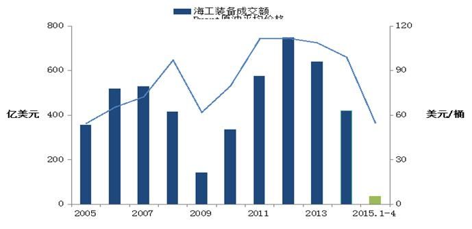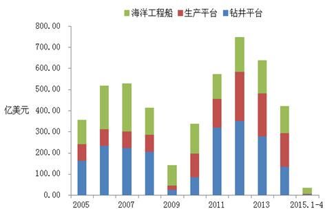 1)在預(yù)期油價(jià)維持低位、油公司大幅削減投資的背景下,2015年海工裝備市場(chǎng)成交額將大幅回落,按1-4月成交趨勢(shì)外推全年約為110億美元,即使考慮后期市場(chǎng)有所改善,預(yù)計(jì)全年也難以突破200億美元。