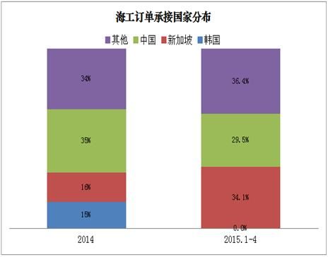 1)2015年1-4月,海工裝備訂單主要來(lái)自亞洲國(guó)家。