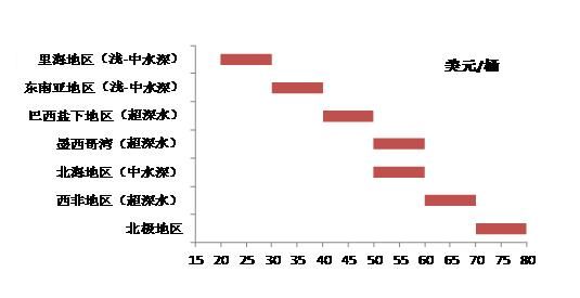 2)盡管絕大部分地區(qū)海洋油氣開(kāi)采的盈虧平衡點(diǎn)(考慮了固定成本和邊際成本的收支平衡點(diǎn))在80美元/桶以下,但由于海洋油氣開(kāi)發(fā)的風(fēng)險(xiǎn)較大,其資本收益率要求較高(可達(dá)30%及以上),隨著長(zhǎng)期油氣開(kāi)發(fā)仍將向深水進(jìn)軍,油價(jià)不可能長(zhǎng)期停留在當(dāng)前的水平。