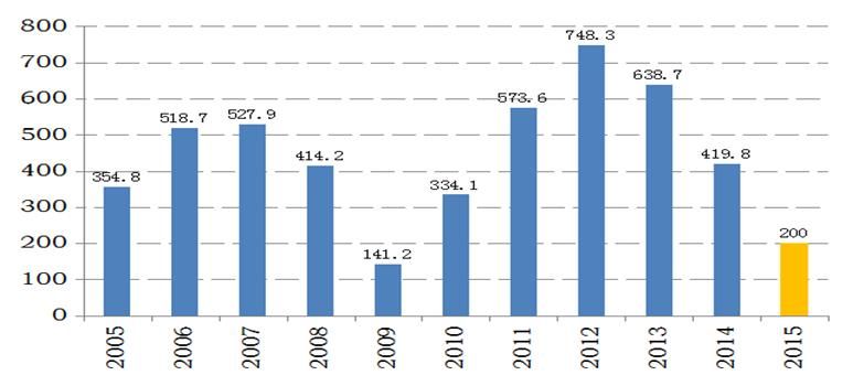 1)三大主力船型市場(chǎng)均處于下行狀態(tài),2015年總體情況不容樂(lè)觀,成交量較上一年大幅萎縮至7000萬(wàn)載重噸左右。