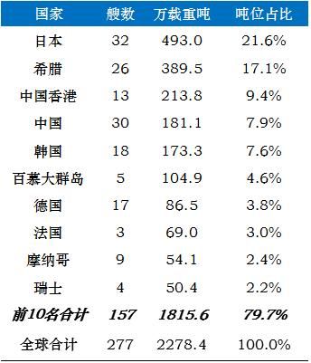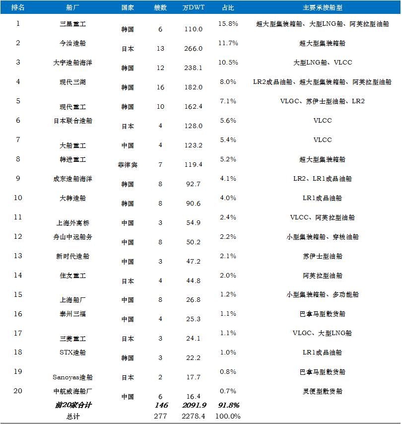 2)目前世界排名前十造船企業(yè)以韓日船廠為主,中國(guó)僅有大船重工一家船廠。