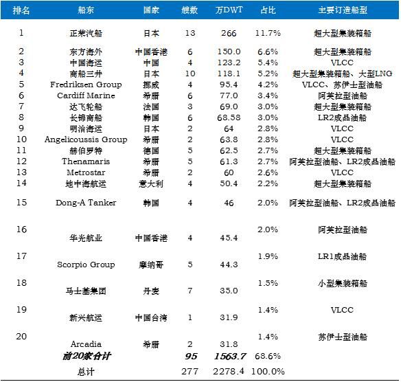2015年1月-4月全球新船訂造量前20船東