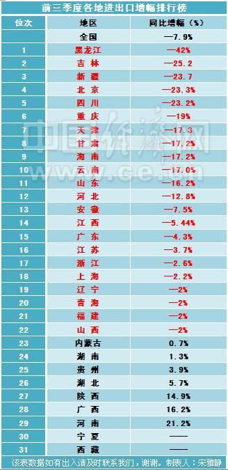 中國經(jīng)濟(jì)網(wǎng)記者疏理制作了前三季度各地進(jìn)出口情況表,表中可以看出外貿(mào)形勢的復(fù)雜與嚴(yán)峻性,除了寧夏、西藏兩地未公布數(shù)據(jù),在已經(jīng)公布的29個省區(qū)中,有22省區(qū)外貿(mào)進(jìn)出口值均為負(fù)增長。其中黑龍江情況最差,以同下降42%為全國倒數(shù)第一,吉林同比下降25.2%倒數(shù)第二,新疆同比下降23.7%倒數(shù)第三。東北三省在做整體經(jīng)濟(jì)不振的情況下,進(jìn)出口貿(mào)易受到的不良影響也十分明顯。