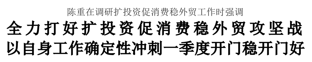 調(diào)研期間,陳重主持召開座談會(huì),聽取擴(kuò)投資促消費(fèi)穩(wěn)外貿(mào)攻堅(jiān)戰(zhàn)部署落實(shí)情況等匯報(bào)。他強(qiáng)調(diào),要加強(qiáng)經(jīng)濟(jì)運(yùn)行調(diào)度,緊盯外部環(huán)境變化,強(qiáng)化動(dòng)態(tài)監(jiān)測(cè)分析和科學(xué)研判,進(jìn)一步找準(zhǔn)問題癥結(jié)、拿出實(shí)招硬招,確保全市經(jīng)濟(jì)平穩(wěn)運(yùn)行。要著力抓好項(xiàng)目謀劃招引建設(shè),扎實(shí)做好項(xiàng)目前期,提高項(xiàng)目?jī)?chǔ)備質(zhì)量,搶抓窗口期,最大化爭(zhēng)取資金用好政策,積極謀劃實(shí)施一批大宗樞紐領(lǐng)域重大產(chǎn)業(yè)項(xiàng)目,力爭(zhēng)更多項(xiàng)目列入國(guó)家專項(xiàng)規(guī)劃盤子;聚焦高新技術(shù)企業(yè)和專精特新項(xiàng)目,采取產(chǎn)業(yè)鏈招商等方式,加快招引一批大項(xiàng)目、好項(xiàng)目,特別是制造業(yè)項(xiàng)目,切實(shí)增強(qiáng)發(fā)展后勁;用好三分協(xié)調(diào)機(jī)制,做好做透要素保障,確保“千項(xiàng)萬億”項(xiàng)目按期開工。要著力推進(jìn)消費(fèi)轉(zhuǎn)型升級(jí),一方面要用好政策、優(yōu)化舉措,全力提振消費(fèi)市場(chǎng),另一方面要打造八大服務(wù)消費(fèi)新場(chǎng)景,積極培育康養(yǎng)消費(fèi)、情緒消費(fèi)、沉浸式消費(fèi)、夜間消費(fèi)、悅己消費(fèi),持續(xù)優(yōu)化消費(fèi)結(jié)構(gòu),營(yíng)造放心消費(fèi)環(huán)境。要著力打好“穩(wěn)拓調(diào)優(yōu)”組合拳,精準(zhǔn)做好重點(diǎn)企業(yè)幫扶,深化政企團(tuán)組境外拓市場(chǎng)行動(dòng),充分挖掘出口業(yè)務(wù)增量,引導(dǎo)企業(yè)拓展“一帶一路”沿線新興市場(chǎng),支持優(yōu)勢(shì)產(chǎn)業(yè)內(nèi)外貿(mào)一體聯(lián)動(dòng),加快培育外貿(mào)新動(dòng)能。要結(jié)合實(shí)干爭(zhēng)先活動(dòng),樹牢重實(shí)干、務(wù)實(shí)功、拼實(shí)績(jī)鮮明導(dǎo)向,進(jìn)一步強(qiáng)化責(zé)任落實(shí)、加強(qiáng)部門協(xié)同,用進(jìn)度說話、用數(shù)據(jù)說話、用項(xiàng)目說話、用結(jié)果說話,以過硬作風(fēng)保障各項(xiàng)工作落地見效。